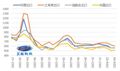 目前我國(guó)厚壁鋼管出口報(bào)價(jià)優(yōu)勢(shì)仍存。研究中心監(jiān)測(cè)數(shù)據(jù)顯示,截至2024年4月11日,印度、土耳其、獨(dú)聯(lián)體熱軋卷板出口報(bào)價(jià)(FOB)分別為560美元/噸、605美元/噸和565美元/噸,中國(guó)熱軋卷板出口報(bào)價(jià)(FOB)為515美元/噸;目前我國(guó)熱卷出口報(bào)價(jià)分別較印度、土耳其、獨(dú)聯(lián)體熱卷出口報(bào)價(jià)低45美元/噸、90美元/噸和50美元/噸(詳見圖4)。