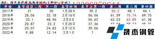 截至1月24日,貴陽建筑鋼材庫存11.9萬噸,節前第二周庫存為9.88萬噸,較往年同期減少10.19萬噸,降幅達50.77%,據商家反饋,今年冬儲沒有做的原因:一是無縫鋼管廠政策沒往年有吸引力,二是對春節后需求不看好,三是市場實在是沒有資源。據歷史數據來看,2017年以來,貴陽建材庫存峰值大多是在第三周左右出現(除2020年受公共突發衛生事件影響峰值出現在第六周),峰值平均值在63萬噸,平均累庫值在31萬噸。考慮到當前貴州本地無縫鋼管廠及周邊區域無縫鋼管廠生產節奏,參考往年數據,預計春節后貴陽建材庫存峰值在32萬噸,大概率出現在第三周,節后累庫值在18-20萬噸。
