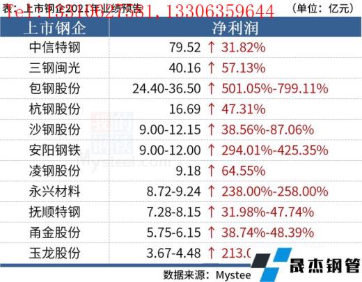 免責聲明:本網站(山東聊城晟杰無縫鋼管廠m.www-86604.com)刊載的“2021年鋼企利潤創新高,中信特鋼實現凈利近80億”等均源于網絡,版權歸原作者所有,且僅代表原作者觀點,本文所載信息僅供參考。轉載僅為學習與交流之目的,如無意中侵犯您的合法權益,請及時聯系刪除。本網站刊登此篇文章并不意味著本站贊同其觀點或證實其內容的真實性,我們不對其科學性、嚴肅性等作任何形式的保證。如果侵犯了您的版權,請盡快聯系我們予以撤銷,謝謝合作!