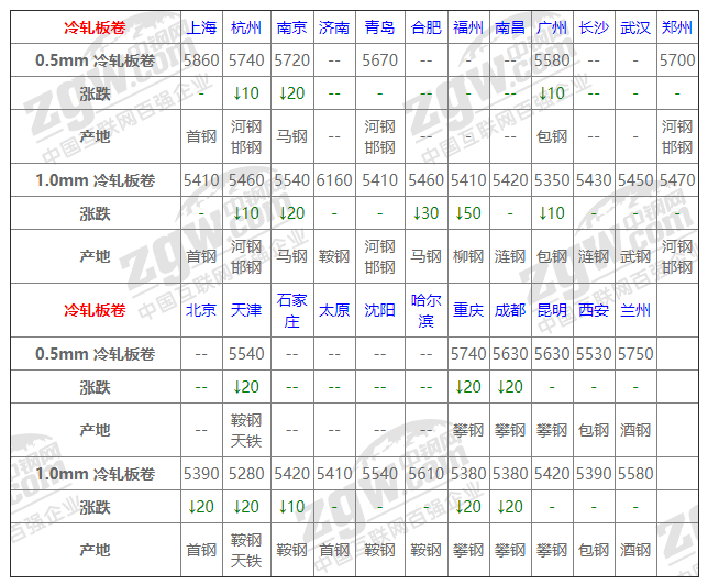 全國23個主要市場1.0mm 冷軋板卷平均價格5468元/噸,較上個交易日下調8元/噸。