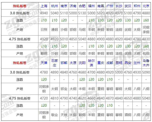全國24個主要市場3.0 熱軋板卷平均價格4922元/噸,較上個交易日下調14元/噸。