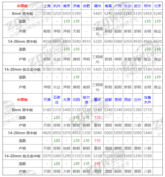 全國23個主要市場14-20mm 普中板平均價格5017元/噸,較上個交易日下調(diào)3元/噸。
