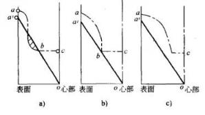 表中數(shù)據(jù)表明:感應(yīng)加熱淬火半軸的靜扭強度高于調(diào)質(zhì)半軸,感應(yīng)加熱淬火層愈深,其靜扭強度愈高。數(shù)據(jù)還表明,40MnB鋼中頻感應(yīng)加熱淬火可以代替40CrMnMo鋼調(diào)質(zhì)半軸。表5 中數(shù)據(jù)還表明:中頻感應(yīng)加熱淬火半軸疲勞壽命比調(diào)質(zhì)半軸提高很多倍,因此半軸調(diào)質(zhì)處理工藝多數(shù)已被中頻感應(yīng)加熱淬火所取代。(2)半軸感應(yīng)加熱淬火工藝參數(shù)的選擇:半軸淬硬層深度的確定應(yīng)以保證半軸內(nèi)任何一點的扭轉(zhuǎn)應(yīng)力均小于或等于該點的剪切屈服強度。圖3 中點劃線表示半軸感應(yīng)加熱淬火后的強度分布情況,a'o表示半軸的扭轉(zhuǎn)應(yīng)力分布情況。若淬硬層太淺,則半軸強度不足,圖3a中b'b區(qū)域為危險區(qū);若淬硬層太深,圖3c,則由于半軸表層殘留壓應(yīng)力降低而降低疲勞壽命。合適的淬硬層深度應(yīng)如圖3b所示。
