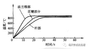 ▲圖7采用矩形感應(yīng)器整體一次感應(yīng)加熱淬火時,半軸表面的均溫加熱曲線由于在有效圈A端圓弧(見圖6) 上鑲有硅鋼片導磁體,所以法蘭根部圓角部位升溫較快,加熱均溫時間長,保證了該處的硬化層深和足夠的硬化區(qū)域。采用整體一次感應(yīng)加熱淬火還能提高花鍵齒頂?shù)挠捕取2捎镁匦胃袘?yīng)器加熱時,由于感應(yīng)器和零件之間間隙較大(一般為5~8mm),所以升溫慢,加熱時間長,硬化層厚且均勻。半軸回火也可采用矩形感應(yīng)器加熱,采用15~20℃/s的升溫速度,控制感應(yīng)加熱回火溫度在(250±10)℃范圍內(nèi),可以使半軸表面硬度控制在52~63HRC的范圍內(nèi),性能良好。