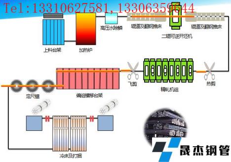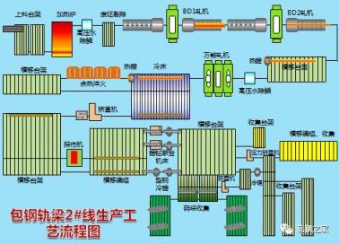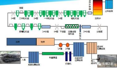 加熱爐、高壓水除鱗、軋機(jī)、輪廓儀或測徑儀、剪或鋸、熱打印機(jī)、冷床、矯直機(jī)、編組臺架、碼垛臺架、打捆機(jī)、稱重設(shè)備、噴標(biāo)等設(shè)備