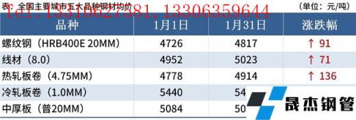 1月國內(nèi)厚壁無縫鋼管市場整體呈現(xiàn)了震蕩偏強(qiáng)走勢,而板材價格分化明顯,螺紋鋼修復(fù)性反彈近百元,熱軋板卷上漲了136元,但中厚板表現(xiàn)趨弱。原料方面價格漲幅強(qiáng)于預(yù)期,1月在無縫厚壁鋼管廠家復(fù)產(chǎn)和節(jié)前補(bǔ)庫需求支撐下,鐵礦石價格持續(xù)上漲,62%澳洲粉礦港口現(xiàn)貨價格指數(shù)960.0元/濕噸,環(huán)比月初上漲158.0元/濕噸,漲幅19.7%。整體來看,宏觀消息面利好,厚壁無縫鋼管供應(yīng)快速下滑,導(dǎo)致庫存累積幅度不及預(yù)期,而需求結(jié)束較晚,使得鋼價走強(qiáng)。