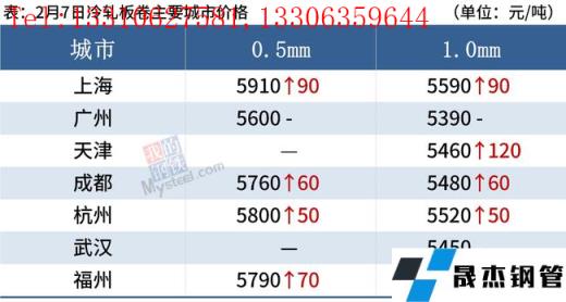 冷軋板卷:2月7日,全國(guó)24個(gè)主要城市1.0mm冷卷均價(jià)5525元/噸,較節(jié)前(1月30日)上漲57元/噸。據(jù)市場(chǎng)反饋,今日大部分鋼貿(mào)企業(yè)未全面復(fù)工,大部分陸續(xù)要8-10號(hào)陸續(xù)進(jìn)入復(fù)工,當(dāng)前市場(chǎng)暫無(wú)明顯成交,受原材料價(jià)格提漲,冷軋貿(mào)易商先提漲價(jià)格,市場(chǎng)呈有價(jià)無(wú)市狀態(tài)。基本面看,截止6號(hào)調(diào)研數(shù)據(jù)顯示,冷軋無(wú)縫厚壁鋼管廠家產(chǎn)能利用率79.10%,周環(huán)比減少2.31%;廠庫(kù)周環(huán)比增加7.16萬(wàn)噸,社庫(kù)周環(huán)比增加8.45,月環(huán)比增加12.30萬(wàn)噸,年同比增加14.03萬(wàn)噸,基本面壓力尚可。預(yù)計(jì)8日全國(guó)冷軋板卷現(xiàn)貨價(jià)格多震蕩上調(diào)為主。