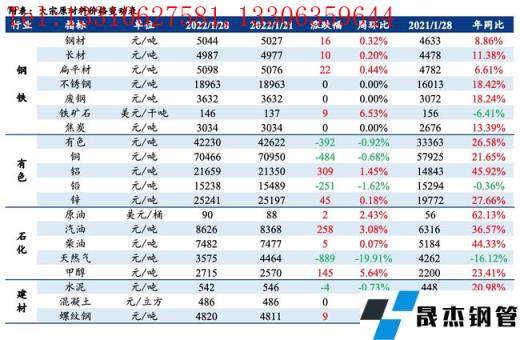 免責聲明:本網站(山東聊城晟杰無縫鋼管廠m.www-86604.com)刊載的“大宗原材料價格周報(1.24-1.28)”等均源于網絡,版權歸原作者所有,且僅代表原作者觀點,本文所載信息僅供參考。轉載僅為學習與交流之目的,如無意中侵犯您的合法權益,請及時聯系刪除。本網站刊登此篇文章并不意味著本站贊同其觀點或證實其內容的真實性,我們不對其科學性、嚴肅性等作任何形式的保證。如果侵犯了您的版權,請盡快聯系我們予以撤銷,謝謝合作!