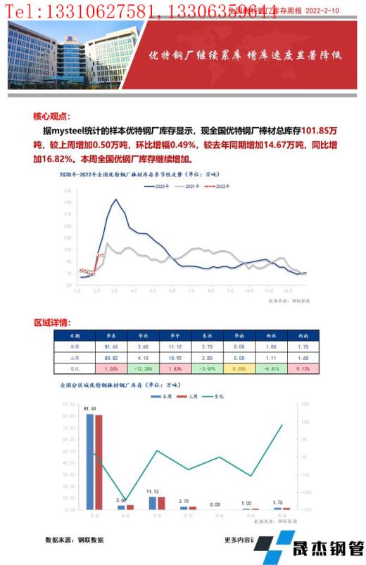 核心觀點: 據mysteel統計的樣本優特無縫厚壁鋼管廠家庫存顯示,現全國優特無縫厚壁鋼管廠家棒材總庫存101.85萬噸,較上周增加0.50萬噸,環比增幅0.49%,較去年同期增加14.67萬噸,同比增加16.82%。本周全國優無縫厚壁鋼管廠家庫存繼續增加。