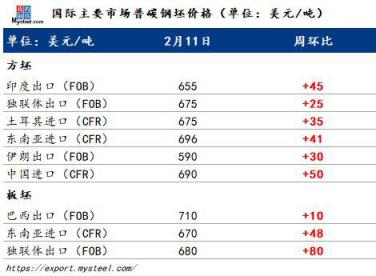 本周獨(dú)聯(lián)體價格持續(xù)上漲。目前方坯出口價格約為670-680美元/噸FOB,較節(jié)前上漲約30美元/噸。