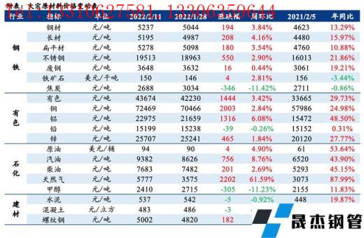 免責聲明:本網站(山東聊城晟杰無縫鋼管廠m.www-86604.com)刊載的“周報:大宗原材料價格周報(2.07-2.11)”等均源于網絡,版權歸原作者所有,且僅代表原作者觀點,本文所載信息僅供參考。轉載僅為學習與交流之目的,如無意中侵犯您的合法權益,請及時聯系刪除。本網站刊登此篇文章并不意味著本站贊同其觀點或證實其內容的真實性,我們不對其科學性、嚴肅性等作任何形式的保證。如果侵犯了您的版權,請盡快聯系我們予以撤銷,謝謝合作!