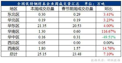 2、本周全國優特鋼棒材樣本企業成交量25.15萬噸,較節前一周成交增1.67,增幅7.1%,同比去年節后第一周上升2.23萬噸,增幅9.72%。