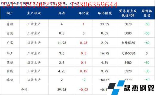 數據:山東優特無縫厚壁鋼管廠家庫存29.28萬噸,環比增下降0.02萬噸,減少0.07%,同比減少1.29萬噸,減少4.22%。