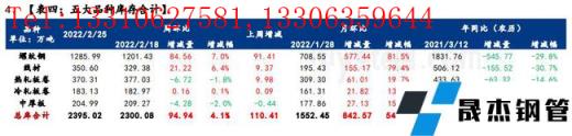 庫存方面,五大品種厚壁無縫鋼管總庫存春節(jié)后連續(xù)累增四周,環(huán)比上周增加94.94萬噸,增幅4.1%。分品種看,建材庫存增加105.78萬噸,增幅為6.9%;板材庫存減少10.84萬噸,降幅1.4%;分指標(biāo)看,無縫厚壁鋼管廠家?guī)齑姝h(huán)比增加8.69萬噸,增幅1.4%;社會(huì)庫存環(huán)比增加86.25萬噸,增幅5.2%。