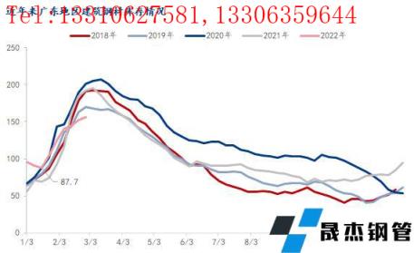 庫存方面,截止2月28日,根據廣州建材倉庫同口徑統計,建筑厚壁無縫鋼管總庫存156.1萬噸,周環比增加3.92萬噸,連續6周回升。其中螺紋鋼庫存92.7萬噸,周環比增加5.06萬噸;線材63.4萬噸,周環比減少1.14萬噸。近年來春節后廣東省庫存量均呈現增加態勢,其中2020年節后庫存總量最高;據調研,節后廣東建筑厚壁無縫鋼管庫存峰值均出現第3-5周,累庫周期約24天左右;雖然2022年節前價格偏高,但節前現貨價格上漲,帶動市場不少商家主動性囤貨、備貨,節前庫存總量并未出現明顯累庫現象。節后開市,在疫情等因素影響下,累庫速度遠低于往年,因此預計短期庫存仍有增加的可能,但峰值難超去年,且最近2-3周可能會迎來庫存拐點。