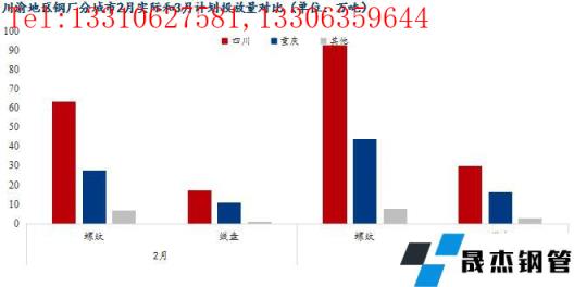 2、3月份川渝地區(qū)建筑厚壁無縫鋼管生產(chǎn)企業(yè)計(jì)劃投放總量192.67萬噸,環(huán)比增加52.33%;其中螺紋鋼計(jì)劃投放144.52萬噸,環(huán)比增加49.36%,線盤計(jì)劃投放48.15萬噸,環(huán)比增加41.88%。