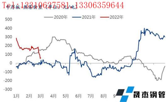 從品種價差方面的情況來看,2月份熱軋板卷與中厚板之間的價差為168.25元/噸,1月份熱軋板卷與中厚板之間的價差為196.94元/噸,價差縮小28.69元/噸;2021年同期數據為0.53元/噸,同比價差擴大167.72元/噸。(備注:價差是指的中厚板價格減去熱軋板卷價格)具體情況如下圖所示: