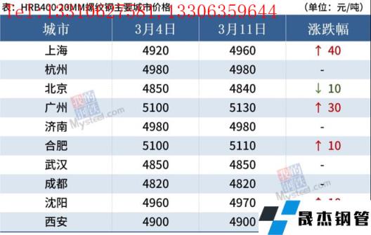 截至3月11日,全國主要城市20mm三級抗震螺紋鋼均價4952元/噸,周環比上漲6元/噸;8.0mmHPB300高線均價5164元/噸,周環比上漲3元/噸。