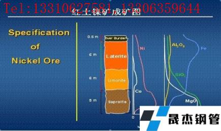 鎳紅土礦通常分三個(gè)層次成礦:第一層: 紅土鎳Ni0.9-1.1%Fe45-50%;第二層:鎳褐鐵礦 Ni1.4-1.9%Fe20%-30%;第三層:腐泥土鎳礦Ni2.0-2.6%Fe15%。