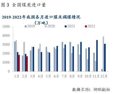 2022年1-2月我國(guó)原煤生產(chǎn)加快,累計(jì)同比增長(zhǎng)10.3%。1-2月我國(guó)進(jìn)口煤同比下降14%,較12月降幅收窄。1-2月全國(guó)用電量增長(zhǎng)5.8%,主要是城鄉(xiāng)居民用電增長(zhǎng)帶動(dòng),而發(fā)電量增長(zhǎng)4%,主要是清潔能源貢獻(xiàn)大。2022年2月,全國(guó)平均氣溫為-3.4℃,較常年同期偏低2.1℃,為2009年以來歷史同期最低;全國(guó)平均降水量25.3毫米,較常年同期偏多66%,為1961年以來歷史同期第三多。
