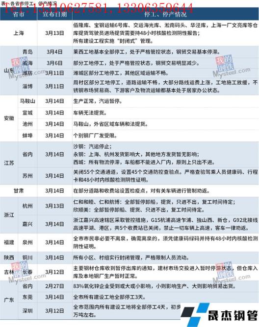 據(jù)統(tǒng)計,截至3月15日,全國多個省市發(fā)布停工停產(chǎn)情況。其中受疫情影響最大的吉林省于3月12日宣布,長春市主要厚壁無縫鋼管倉庫暫停出庫,當(dāng)?shù)亟ú氖袌鼋煌哆M(jìn)入暫時停滯狀態(tài),倉庫入庫及本地?zé)o縫厚壁鋼管廠家生產(chǎn)暫時正常。深圳市于3月12日宣布,全市范圍內(nèi)所有建設(shè)工地暫定停工排查4天,南山及福田區(qū)域厚壁無縫鋼管市場預(yù)計共影響需求量約6640噸,深圳全市范圍初步預(yù)計共影響建筑厚壁無縫鋼管需求量約6萬噸。與此同時,全國其他地區(qū)鋼貿(mào)交易也受到影響,部分工地開始停工,物流運輸暫停服務(wù)。具體情況如下: