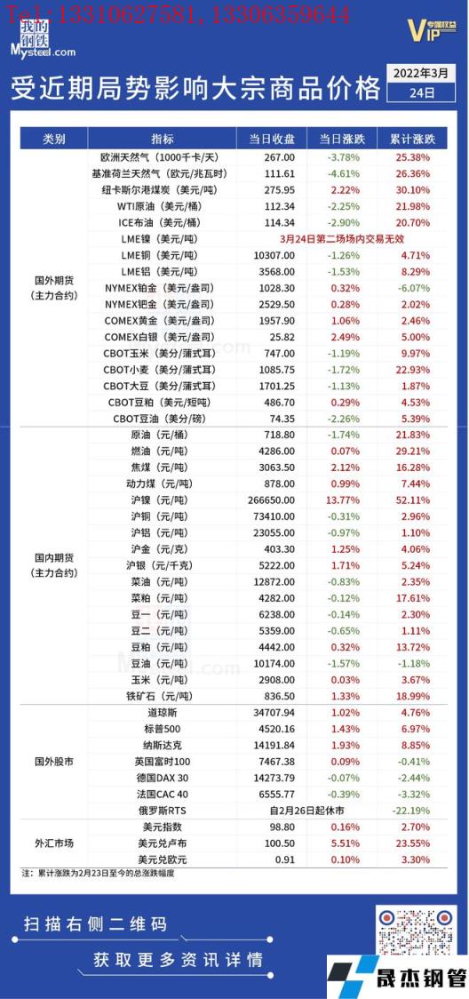 近期,受?chē)?guó)際局勢(shì)影響,全球金融及大宗商品市場(chǎng)出現(xiàn)較大波動(dòng)。3月24日,國(guó)際油價(jià)、能源價(jià)格下跌,倫敦金屬交易所(LME)表示,3月24日鎳的第二場(chǎng)場(chǎng)內(nèi)交易將被視為受到干擾,該交易期間達(dá)成的所有交易將無(wú)效。匯總情況如下: