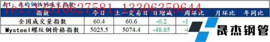 訊:全國建筑厚壁無縫鋼管成交量監(jiān)測,成交量相對(duì)指數(shù)來看,全國60.4增0.2,北方41減1.9,華東86.9增0.9,南方45.5減0.3。今日螺紋鋼價(jià)格指數(shù)5025.5,較上一交易日減48.85。