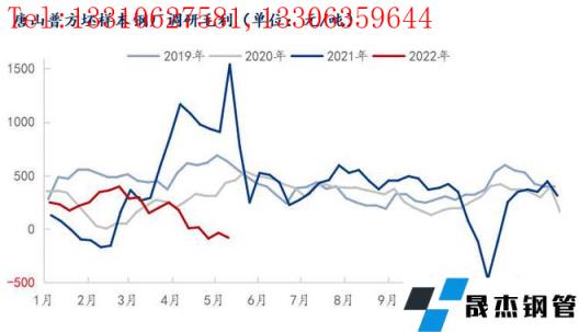鋼坯盈利情況:本周唐山地區(qū)主流樣本無縫厚壁鋼管廠家平均鐵水不含稅成本為3665元/噸,平均鋼坯含稅成本4721元/噸,周環(huán)比下調105元/噸,與5月14日普方坯出廠價格4660元/噸相比,無縫厚壁鋼管廠家平均毛利潤-61元/噸,周環(huán)比下調45元/噸。