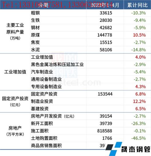 1-4月份,全國規(guī)模以上工業(yè)增加值同比增長4.0%,比1-3月份回落2.5個百分點。4月全國粗鋼日均產(chǎn)量309.27萬噸,環(huán)比增長8.6%。