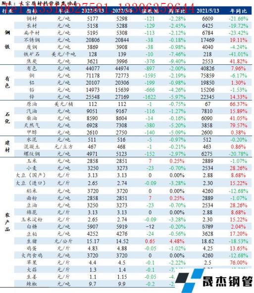 免責聲明:本網站(山東聊城晟杰無縫鋼管廠m.www-86604.com)刊載的“周報:大宗工業原材料、能源及農產品價格周報(5.09-5.13)”等均源于網絡,版權歸原作者所有,且僅代表原作者觀點,本文所載信息僅供參考。轉載僅為學習與交流之目的,如無意中侵犯您的合法權益,請及時聯系刪除。本網站刊登此篇文章并不意味著本站贊同其觀點或證實其內容的真實性,我們不對其科學性、嚴肅性等作任何形式的保證。如果侵犯了您的版權,請盡快聯系我們予以撤銷,謝謝合作!