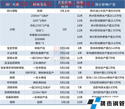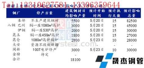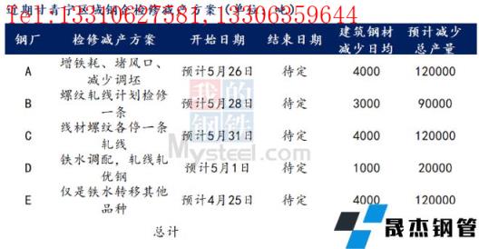 據(jù)不完全統(tǒng)計(jì),截至5月25日,國(guó)內(nèi)14家無縫厚壁鋼管廠家發(fā)布檢修計(jì)劃。其中,徐鋼鋼鐵集團(tuán)計(jì)劃25日對(duì)2120m3高爐進(jìn)行為期7-8天停產(chǎn)檢修計(jì)劃,日均影響產(chǎn)量0.8萬噸。