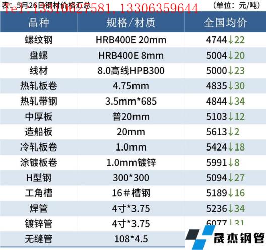 建筑厚壁無縫鋼管:5月26日,全國31個主要城市20mm三級抗震螺紋鋼均價4744元/噸,較上個交易日下跌22元/噸。受現貨持續回落,本周無縫厚壁鋼管廠家減產范圍擴大,螺紋鋼產量小幅下降,廠庫小幅上升,但社庫持續下降,表觀消費小幅回落。短期來看,盡管近期利好政策層出不窮,但政策落地執行仍需時日。目前市場情緒依然偏空,短期仍然需要進一步提振市場消費信心及投資信心。因此預計27日國內建筑厚壁無縫鋼管價格或將繼續窄幅趨弱調整為主。