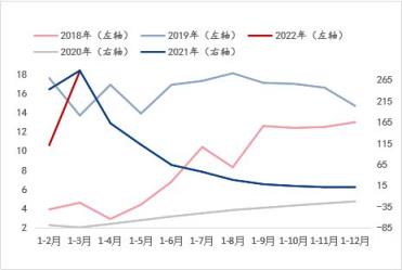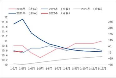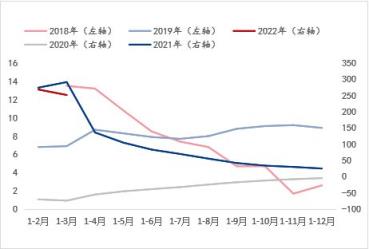 從基礎(chǔ)設(shè)施投資增速和房地產(chǎn)開發(fā)投資增速來看(涉及到對(duì)應(yīng)年份走勢使用左右軸的區(qū)分目的與固定資產(chǎn)投資增速指標(biāo)的說明一致),兩個(gè)指標(biāo)在2020年-2021年非正常環(huán)境條件下的年份增速趨勢基本一致,但在正常環(huán)境條件下的年份增速可以看到,伴隨湖北省每年所需完成的經(jīng)濟(jì)增長目標(biāo)的大背景下,此兩項(xiàng)指標(biāo)的增速表現(xiàn)呈現(xiàn)此消彼長的走勢。而結(jié)合斜率來看,進(jìn)入2022年1-3月,基礎(chǔ)設(shè)施投資增速呈現(xiàn)明顯快速恢復(fù)或釋放態(tài)勢,而房地產(chǎn)開發(fā)投資增速則呈現(xiàn)明顯放緩態(tài)勢。由此看來,對(duì)于建筑厚壁無縫鋼管品種的需求將在房地產(chǎn)板塊的萎縮預(yù)期更為明顯,這與目前所處的房地產(chǎn)調(diào)控政策背景是相符的,即便有所改善,筆者認(rèn)為仍暫難有實(shí)質(zhì)上的新刺激,而基礎(chǔ)設(shè)施投資或?qū)⑹峭械椎闹我蛩刂?。綜合來看,湖北省宏觀指標(biāo)數(shù)據(jù)的預(yù)期演變表明對(duì)于建筑厚壁無縫鋼管品種的需求預(yù)期呈現(xiàn)萎縮態(tài)勢,這與產(chǎn)能角度的供應(yīng)增加形成供需矛盾加劇的預(yù)期,因此這是導(dǎo)致建筑厚壁無縫鋼管價(jià)格偏低運(yùn)行的外因之一。
