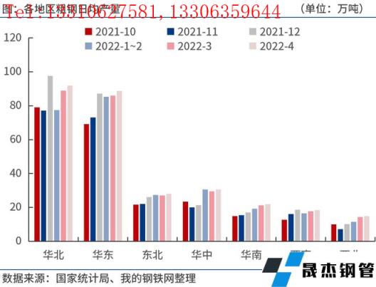 按地區(qū)來看,2022年1-4月份,華北地區(qū)粗鋼產(chǎn)量1.06億噸,同比下降12.8%;華東地區(qū)粗鋼產(chǎn)量1.04億噸,同比下降11.7%;東北地區(qū)粗鋼產(chǎn)量3231.6萬噸,同比下降6.3%;華中地區(qū)粗鋼產(chǎn)量3325.7萬噸,同比下降5.7%;華南地區(qū)粗鋼產(chǎn)量2460.8萬噸,同比下降4.0%;西南地區(qū)粗鋼產(chǎn)量2062.2萬噸,同比下降15.9%;西北地區(qū)粗鋼產(chǎn)量1564.5萬噸,同比下降0.6%。