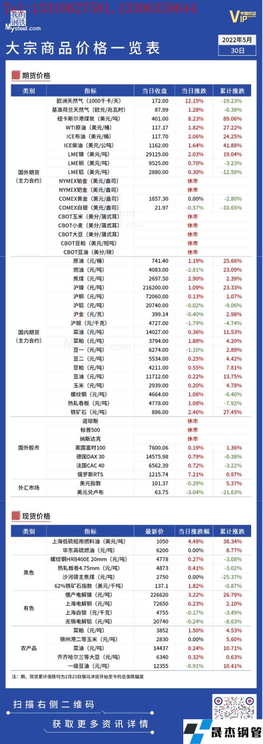 免責聲明:本網站(山東聊城晟杰無縫鋼管廠m.www-86604.com)刊載的“俄烏局勢丨大宗商品價格一覽表(5月30日)”等均源于網絡,版權歸原作者所有,且僅代表原作者觀點,本文所載信息僅供參考。轉載僅為學習與交流之目的,如無意中侵犯您的合法權益,請及時聯系刪除。本網站刊登此篇文章并不意味著本站贊同其觀點或證實其內容的真實性,我們不對其科學性、嚴肅性等作任何形式的保證。如果侵犯了您的版權,請盡快聯系我們予以撤銷,謝謝合作!