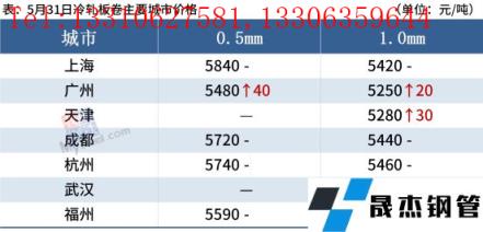 冷軋板卷:5月31日,全國24個主要城市1.0mm冷卷均價5434元/噸,較上個交易日上漲6元/噸。由于本月無縫厚壁鋼管廠家結算多不理想,與市場價格形成倒掛,再加上需求持續疲軟,現貨市場跟漲動力不足,商家多以穩價出貨回籠資金為主,今日整體成交表現一般。據悉,上海6月1日倉庫取消通行證提貨要求,倉庫有望恢復正常加工提貨,由于臨近解封,上海市場觀望情緒較為濃厚,悲觀情緒有所改善。預計1日國內冷軋板卷價格或將震蕩運行為主。