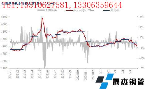 截至5月30日,國內24個主要城市4.75mm熱軋板卷均價為4873元/噸,月環比下跌267元/噸,較去年同期下跌696元/噸。