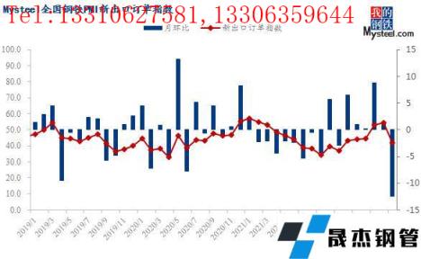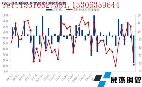 從相關指數來看,本月成品材出廠價指數大幅回落60.4個百分點至8.3,刷新年內低點,無縫厚壁鋼管廠家成品材庫存指數回落9.5個百分點至63.4,仍處榮枯線上方。同時成材價格下跌倒逼原料價格,本月原材料采購價指數大幅回落68.5個百分點至12.1,國內原材料采購量指數回落6.6個百分點至45.3,國外原材料采購量指數回落5.6個百分點至38.5。