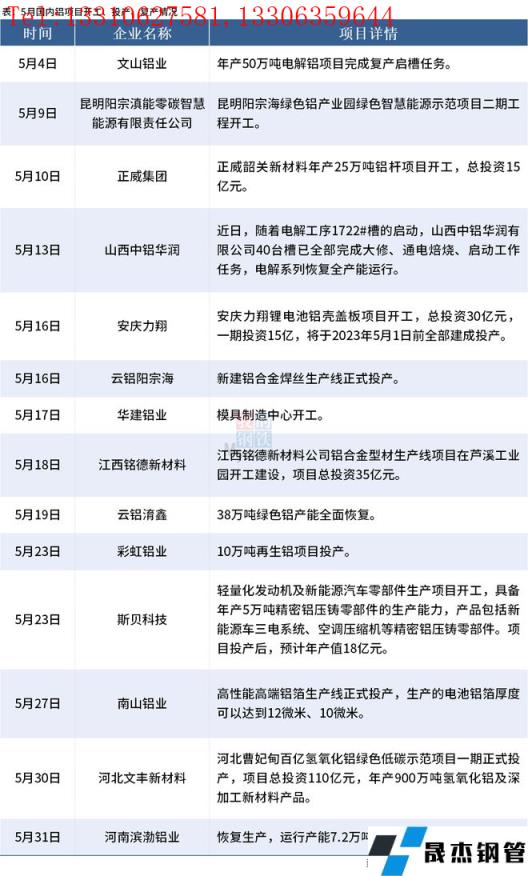 免責聲明:本網站(山東聊城晟杰無縫鋼管廠m.www-86604.com)刊載的“5月國內14個鋁項目開工、投產或復產”等均源于網絡,版權歸原作者所有,且僅代表原作者觀點,本文所載信息僅供參考。轉載僅為學習與交流之目的,如無意中侵犯您的合法權益,請及時聯系刪除。本網站刊登此篇文章并不意味著本站贊同其觀點或證實其內容的真實性,我們不對其科學性、嚴肅性等作任何形式的保證。如果侵犯了您的版權,請盡快聯系我們予以撤銷,謝謝合作!