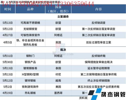 免責聲明:本網站(山東聊城晟杰無縫鋼管廠m.www-86604.com)刊載的“4-5月國外對華鋼鐵產品發起反傾銷調查情況”等均源于網絡,版權歸原作者所有,且僅代表原作者觀點,本文所載信息僅供參考。轉載僅為學習與交流之目的,如無意中侵犯您的合法權益,請及時聯系刪除。本網站刊登此篇文章并不意味著本站贊同其觀點或證實其內容的真實性,我們不對其科學性、嚴肅性等作任何形式的保證。如果侵犯了您的版權,請盡快聯系我們予以撤銷,謝謝合作!