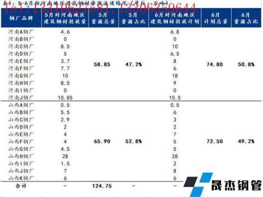 從計劃投放量來看,在統計的11家山西無縫厚壁鋼管廠家中,6月份計劃向晉陜豫市場投放建筑厚壁無縫鋼管資源總計168萬噸,較5月份投放量環比或增加11.3萬噸。其中,6月份計劃向山西地區投放62萬噸,河南地區投放72.5萬噸,陜西地區投放33.5萬噸。