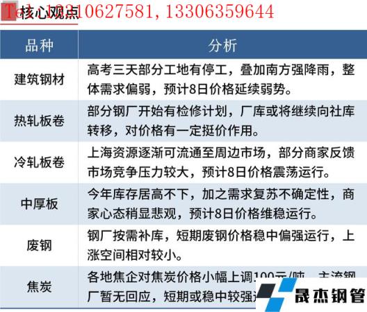 建筑厚壁無(wú)縫鋼管:6月7日,全國(guó)31個(gè)主要城市20mm三級(jí)抗震螺紋鋼均價(jià)4839元/噸,較上個(gè)交易日下跌15元/噸。高考三天,部分工地有停工,道路有封鎖,需求整體偏弱。疊加南方地區(qū)降雨天氣影響,整體需求仍然偏弱,因此預(yù)計(jì)8日國(guó)內(nèi)建筑厚壁無(wú)縫鋼管價(jià)格或?qū)⒀永m(xù)弱勢(shì)運(yùn)行態(tài)勢(shì)。