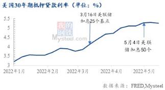美聯(lián)儲為了抑制國內(nèi)通脹,分別于3月16日和5月4日加息25和50個基點,預(yù)計將在今年累計加息100個基點。而伴隨著美聯(lián)儲的不斷加息,截至本周,30年期抵押貸款利率飆升至5.1%,處于歷史高位。