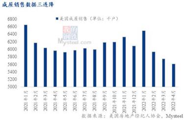 在美聯(lián)儲持續(xù)加息的預(yù)期和房價居高不下的雙重壓力下,美國樓市泡沫逐漸破碎,樓市繁榮面臨考驗。我們預(yù)計5月房屋銷售數(shù)據(jù)和單戶住宅新開工數(shù)量均環(huán)比下滑,帶動著木材價格同樣走弱。