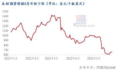 美國木材價格與房市高度相關(guān),隨著消費者對房地產(chǎn)的購買意愿下降,木材價格也隨之降溫。美國木材期貨價格從今年三月初的高點開始下落,截至5月底,木材期貨價格下降765至700美元/千板英尺。