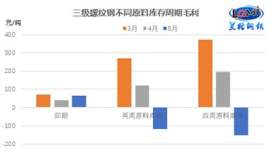 5月份由于成本表現(xiàn)分化,市場均值震蕩下行,使得5月份品種噸鋼毛利相比上月有明顯差異。以三級螺紋鋼為例,以即期原料成本測算5月份毛利空間較上月上升25元/噸,以兩周、四周原料庫存周期測算5月份毛利空間均進入虧損負值區(qū)間,兩周原料庫存周期測算毛利較上月減少239元/噸,以四周原料庫存周期測算5月份毛利空間較上月減少347元/噸(詳見圖2)。