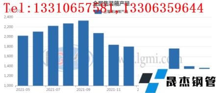 國內下游產品供應分品種來看,5月份國內金屬集裝箱產量為1365萬立方米,環比4月份減產約33.4萬立方米。同比21年同期下降約658.1萬立方米。