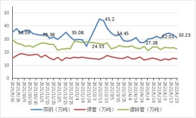 6月面臨美聯(lián)儲加息、國內(nèi)宏觀經(jīng)濟(jì)數(shù)據(jù)偏空雙重壓力,鋼市行情崩塌式探底,焊鍍管價格最高三天降幅達(dá)500元,需求傾向偏弱方向,但上游供應(yīng)壓力不減,市場信心修復(fù)需要時間,行情持續(xù)壓制在低位運(yùn)行。