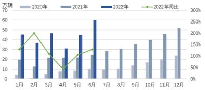 6月份,新能源汽車產(chǎn)銷分別完成59萬(wàn)輛和59.6萬(wàn)輛,同比均增長(zhǎng)1.3倍,產(chǎn)銷量同比增速明顯回升。1-6月份,新能源汽車產(chǎn)銷分別完成266.1萬(wàn)輛和260萬(wàn)輛,同比均增長(zhǎng)1.2倍,市場(chǎng)占有率21.6%。中汽協(xié)預(yù)計(jì),2022年新能源汽車銷量有望達(dá)到550萬(wàn)輛,同比增長(zhǎng)56%以上。