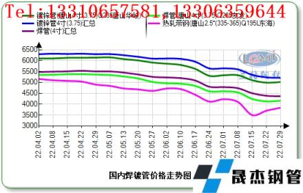 7月國內焊管、鍍鋅管價格逐步探底,階段反彈。據云商平臺監測數據顯示,截至7月29日,全國4寸(3.75)國標焊管平均價格4353元,比上月同期下跌444元,全國4寸(3.75)鍍鋅管平均價格5195元,比上月同期下跌454元;全國50*50*2.5方管平均價格4457元,比上月同期下跌326元;全國219*6螺旋管平均價格4745元,比上月同期下跌428元;持續探底行情下,焊鍍管價格反彈相對上游滯后。
